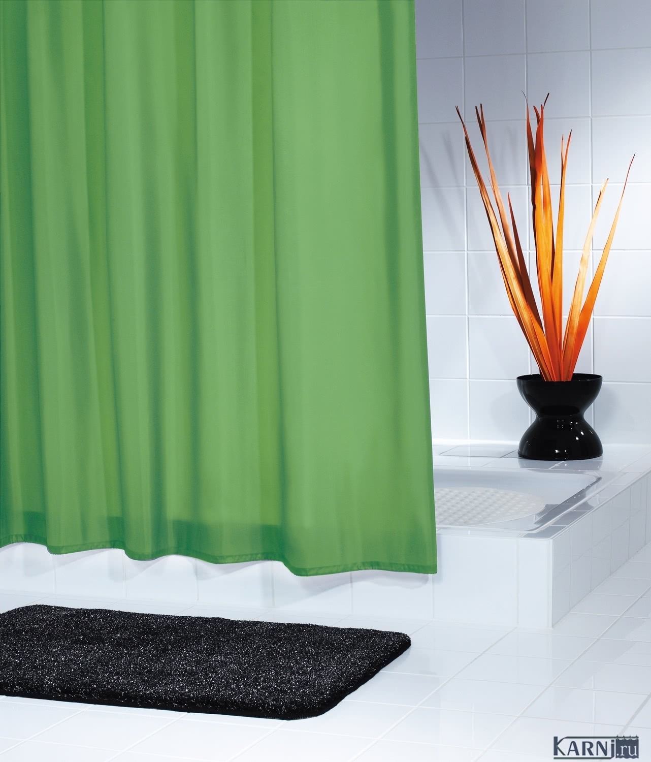 Занавеска из 100% полиэстера для ванны с 12 люверсами под кольца. Штора обработана специальной пропиткой, отталкивающей воду. Внизу по всей длине вшит шнур-утяжелитель.